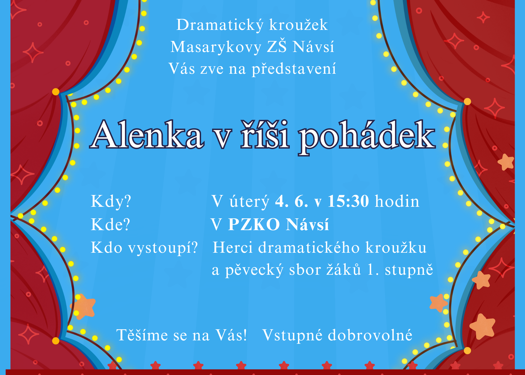 Děti dramatického kroužku Masarykovy základní školy Návsí Vás srdečně zvou na úžasné divadelní představení dne 04.06. od 15:30 do domu PZKO v Návsí.