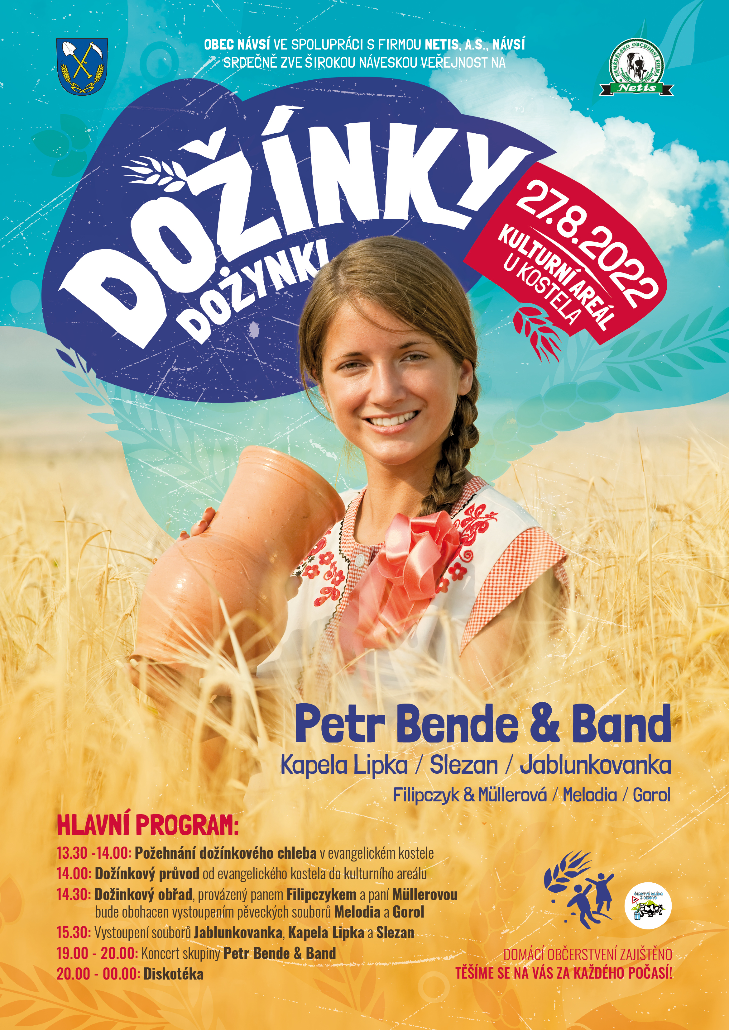 OBEC NÁVSÍ ve spolupráci s firmou NETIS a.s., NÁVSÍ srdečně zve širokou náveskou veřejnost na Dožínky. Akce se koná v sobotu 28. srpna V KULTURNÍM AREÁLU U KOSTELA. VSTUP JE ZDARMA