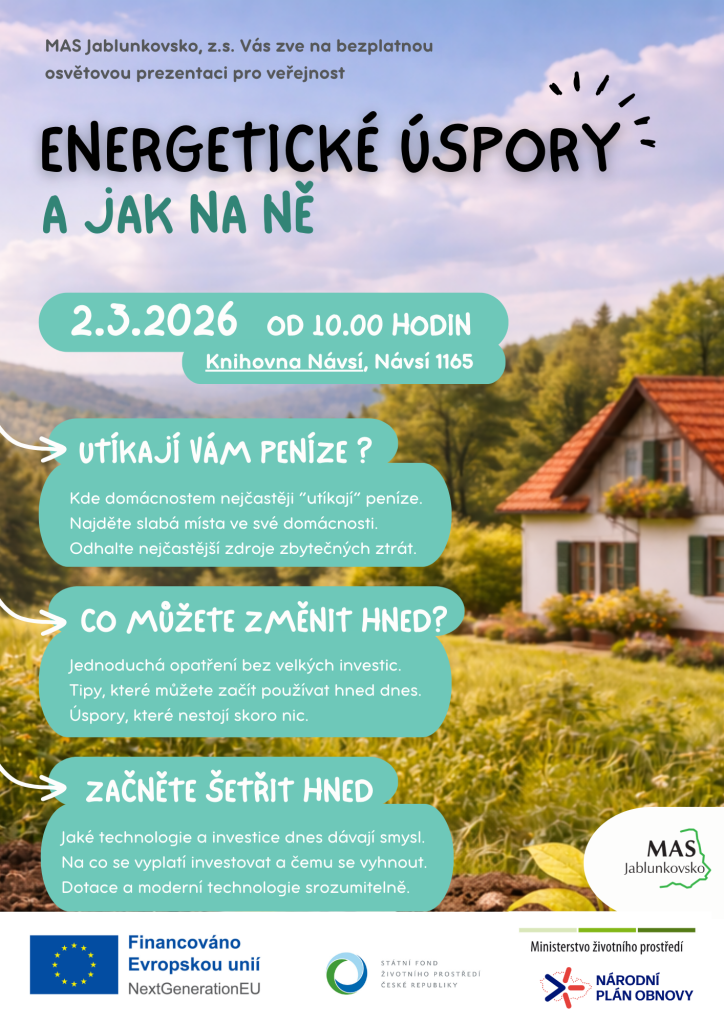 MAS Jablunkovsko Vás zve na bezplatnou osvětovou prezentaci pro veřejnost zaměřenou na energetické úspory v domácnosti. Dozvíte se, kde nejčastěji dochází ke zbytečným ztrátám energie, jak odhalit slabá místa ve svém bydlení a jak snížit své výdaje za energie.