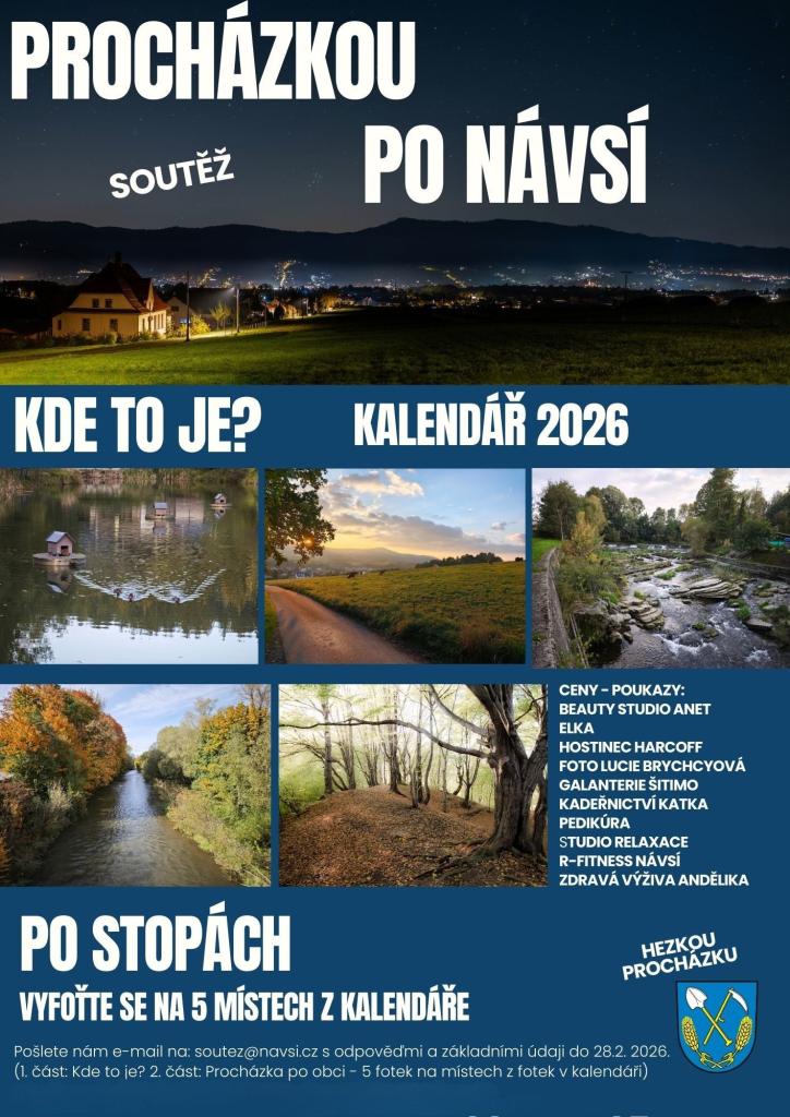 Vydejte se na příjemnou procházku naší krásnou obcí, objevujte známá i méně známá místa a zapojte se do soutěže o jednu z deseti zajímavých cen. Přejeme vám hezké chvíle strávené v Návsí. Komise pro občanské záležitosti Mgr. Pavlína Turoňová