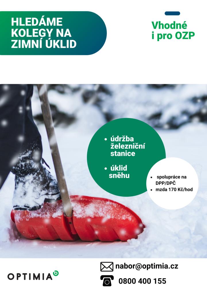 Společnost OPTIMIA aktuálně hledá nové kolegy na zimní údržbu železniční stanice (úklid sněhu). Pracovní místo je vhodné i pro osoby se zdravotním postižením (OZP).